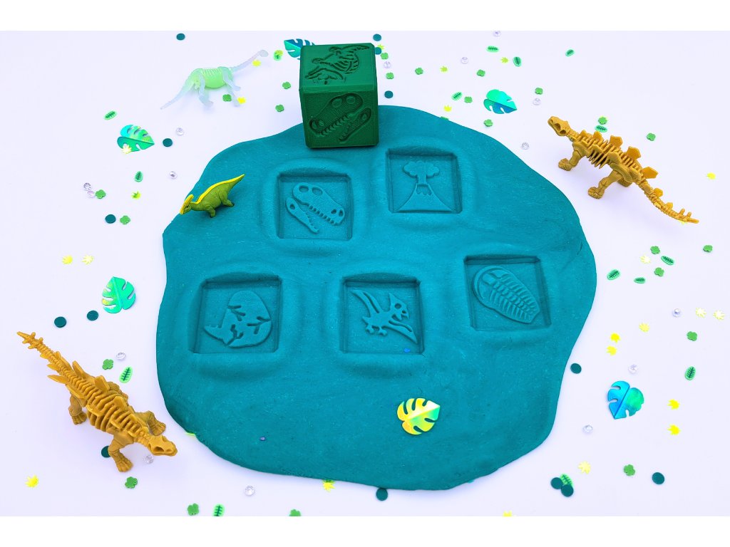 Stačí kostku jemně přitisknout a během okamžiku se objeví dinosauří stopy a siluety, které inspirují děti k vyprávění příběhů, stavění pravěkých krajin i objevování historie Země.